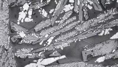 難熔材料組織:鋁(基體),氧化鋯(灰色),硅(白色) (未腐蝕,200x)