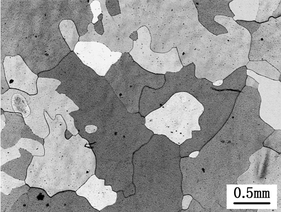在偏振光下研究金相組織,一般只需拋光而不需侵蝕便可獲得清晰,真實的組織。下面列舉其應用: 1、組織與晶粒的顯示 各向異性的多晶體,其晶粒在正交偏振光下可看到不同亮度。亮度不同表征晶粒位向的差別。具有相同亮度的兩個晶粒,有相同的位向。 2、多相合金的相分析 兩相合金中一相為各向同性,另一相為各向異性,很容易由偏振光鑒別。 兩相均為各向同性。經(jīng)適當?shù)幕瘜W侵蝕后,使一相被侵蝕后具有光學各向異性,而對另一相不發(fā)生侵蝕作用。 3、非金屬夾雜物鑒別 在正交偏振光下透明加雜物將有不同的反射規(guī)律。 ① 各向同性不透明夾雜物反射光仍為線偏振光。正交偏振光下呈黑暗一片,轉(zhuǎn)動載物臺一周無明暗變化。如FeO夾雜即屬此類。 ② 各向異性不透明夾雜物在線偏振光照射下將發(fā)生振動面的旋轉(zhuǎn),使反射偏振光檢偏鏡改變正交位置,部分光線可通過檢偏鏡。轉(zhuǎn)動載物臺一周觀察到四次明亮,四次消光。如鋼中FeS夾雜可觀察到這一現(xiàn)象。 ③ 各向同性透明夾雜物在正交偏振光下可觀察到與暗視場相同的顏色(體色)。如MnO,具有各向同性,正交偏振光下與暗場下觀察到相同的顏色—綠色。 ④ 各向異性透明夾雜物在正交偏振光下可觀察到包括體色和表色組成的色彩。如鈦鐵礦(FeO·TiO2),三角晶系,各向異性,暗場下薄層時透明,呈玫瑰色或褐色等。偏光下呈閃耀明亮的玫瑰色。 ⑤ 透明球形夾雜物除可顯示透明度及色彩外,還可看到黑十字效應及等色環(huán)。如球狀玻璃質(zhì)的SiO2夾雜。 4、范性變形,擇優(yōu)取向及晶粒位向的確定 如果多晶體金屬受外界條件的影響,晶粒以要位向排列起來,例如范性變形后,或范性變形再結(jié)晶后晶粒的擇優(yōu)取向(即變形織構或再結(jié)晶織構),由于多晶體位向的一致排列,在同一金屬磨面上將有一致的光軸位向,因此,正交偏振光下整個視閾內(nèi)明暗程度應趨于一致,近于單晶體的偏振效果。或整個視閾明亮,或整個視閾黑暗。 變形鋁合金、鑄造鋁合金在檢驗金相組織時用通常的混合酸(Keller′s試劑)很難顯露晶粒邊界,同時,在明場條件下觀察,組織襯度也不好。