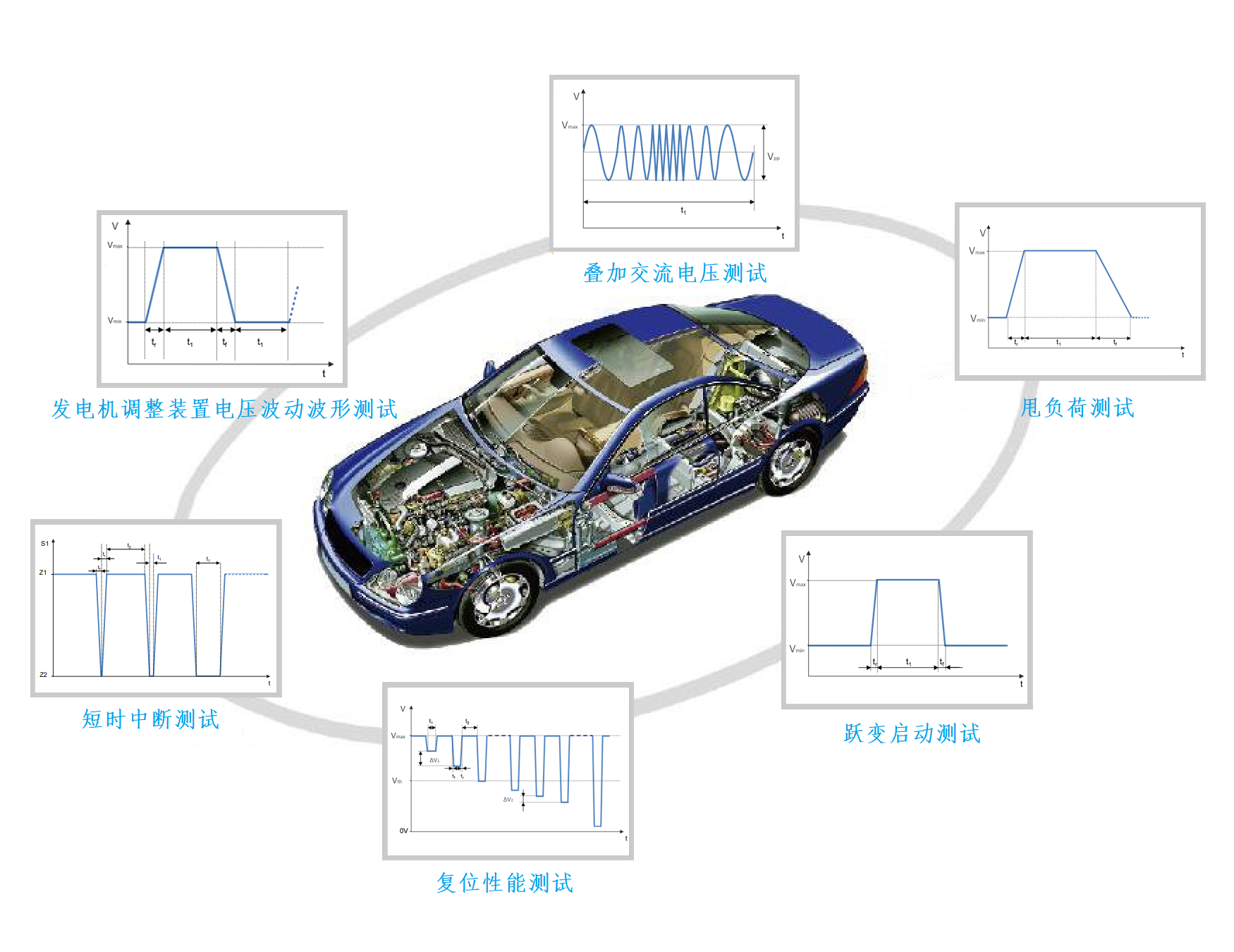 本測(cè)試系統(tǒng)可為各汽車公司制定的電性能測(cè)試標(biāo)準(zhǔn)要求提供靈活的解決方案,應(yīng)用于檢測(cè)汽車零部件的功能檢驗(yàn)和可靠性能檢驗(yàn),可滿足GMW 3172、VW 80000、LV 124等汽車企業(yè)標(biāo)準(zhǔn)的測(cè)試要求。